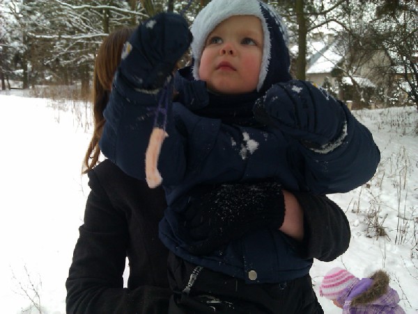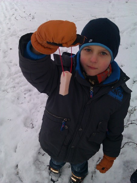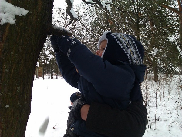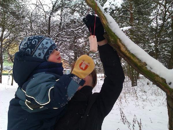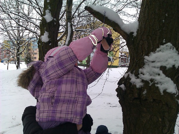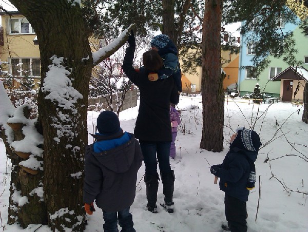 Podczas spaceru odwiedziliśmy pobliski lasek. Postanowiliśmy, że zadbamy również o ptaki w nim mieszkające. Dzieci wieszały słoninę dla sikorek na drzewach. Obserwowaliśmy również różne ślady znajdujące się na śniegu i próbowaliśmy odgadnąć, kto je zostawił. Przyjrzeliśmy się również ptakom, które nam towarzyszyły. Dzieci starały się rozpoznawać ich nazwy kierując się wielkością, kolorem upierzenia. Mieliśmy okazję zaobserwować wróbelki, wrony oraz gołębie.