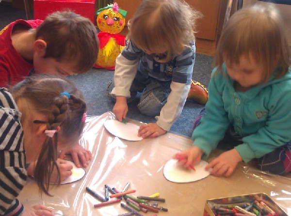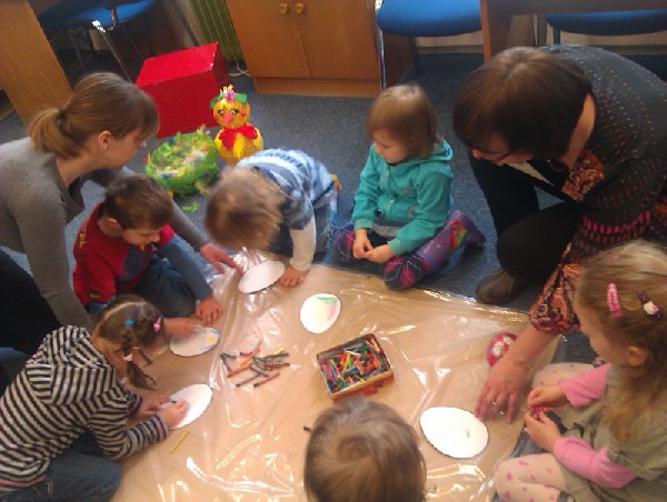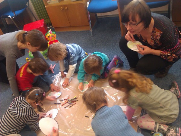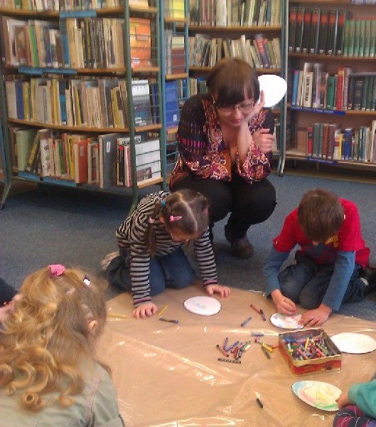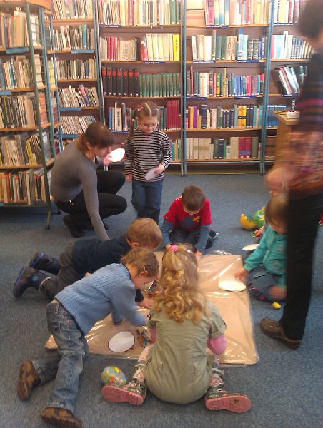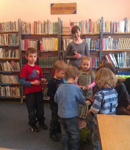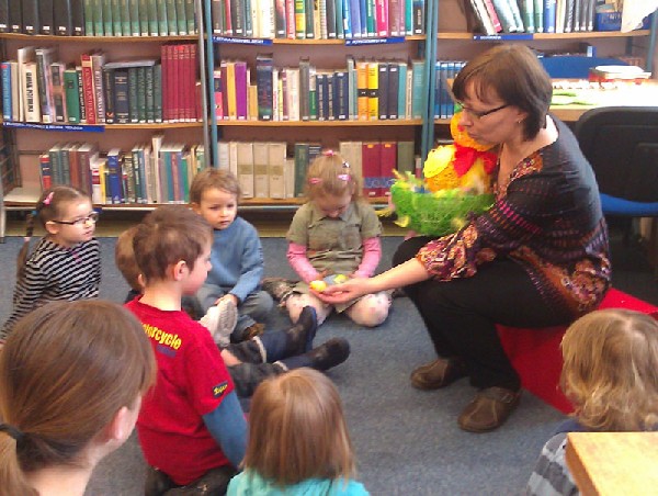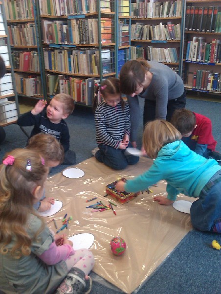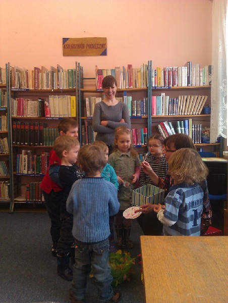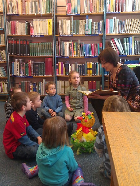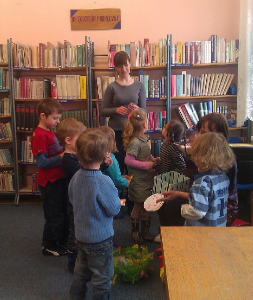 W środę 13 kwietnia wybraliśmy się na wycieczkę do biblioteki. Na miejscu czekała na nas pani bibliotekarka Joanna Marciniak, która miło nas powitała i zaprosiła do obejrzenia licznych książek zgromadzonych w tym miejscu. Następnie Pani Joasia przeczytała nam bajkę o kolorowych pisankach, pokazując jednocześnie różnobarwne jajka i opowiadając o wielkanocnych tradycjach. Kolejnie przystąpiliśmy do zadań plastycznych. Naszym zadaniem było pokolorowanie przygotowanych jajek. Świetnie sobie poradziliśmy z tym zadaniem. Na koniec tego spotkania podziękowaliśmy Pani bibliotekarce za poświęcony nam czas i słodkie niespodzianki, jakie otrzymaliśmy w zamian za kolorowe pisanki. Pożegnaliśmy się i wróciliśmy pieszo do przedszkola. Pomimo niezbyt sprzyjającej pogody wycieczka bardzo się dzieciom podobała.