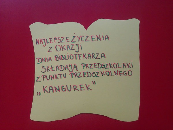 Dnia 9 maja udaliśmy się z wizytą do Biblioteki Miejskiej. Celem wycieczki było złożenie życzeń Pani Joannie Marciniak z okazji Dnia Bibliotekarza. Przedszkolaki wykonały dla Pani Joasi piękną laurkę w kształcie książki. Podczas wizyty dzieci złożyły Pani bibliotekarce życzenia, wręczyły laurkę oraz kwiatki. Każdy opowiedział Pani Joasi co dla niej narysował. Przedszkolaki obiecały Pani bibliotekarce, że nie zapomną o bibliotece i na pewno jeszcze tam powrócą.