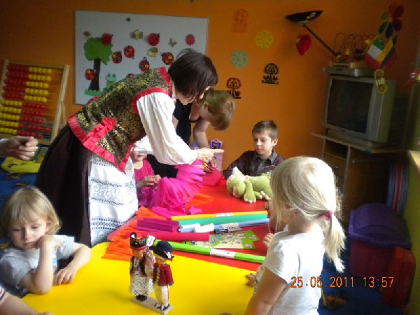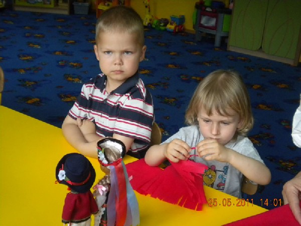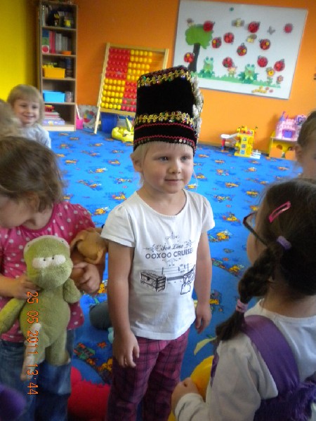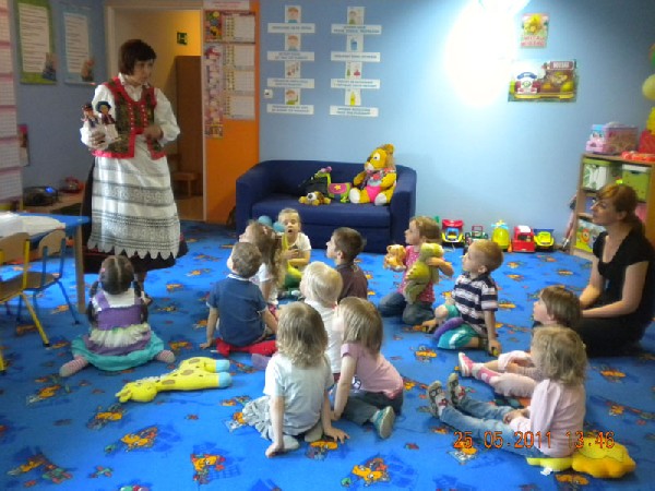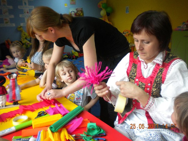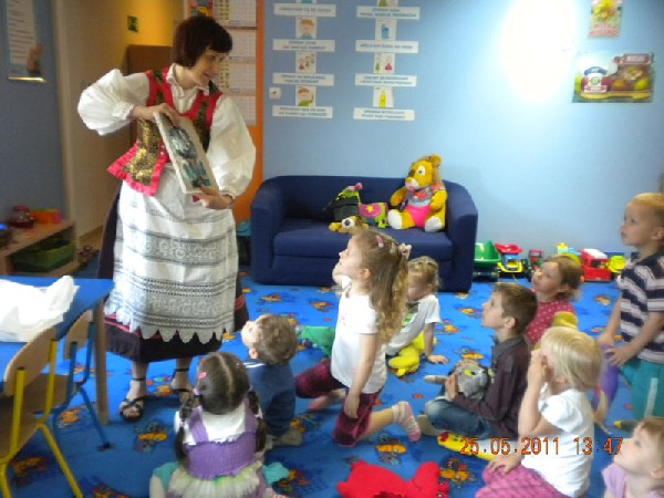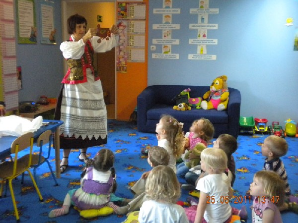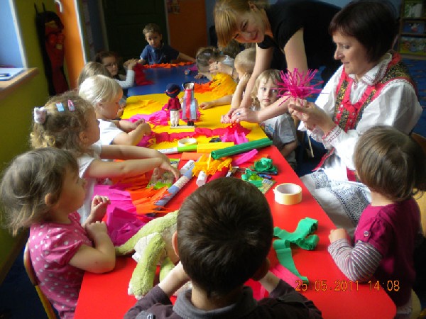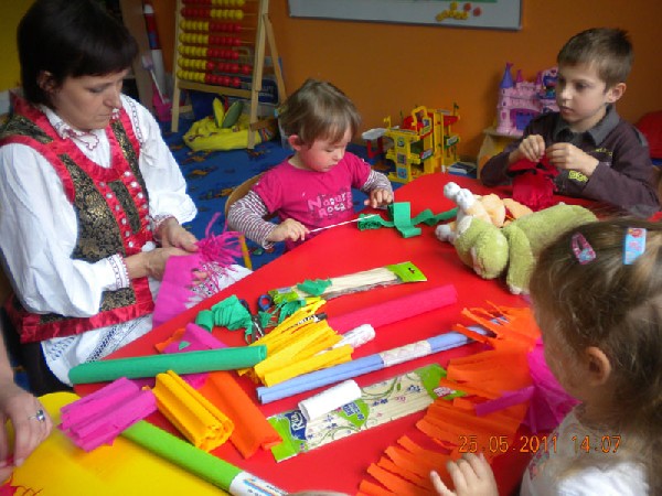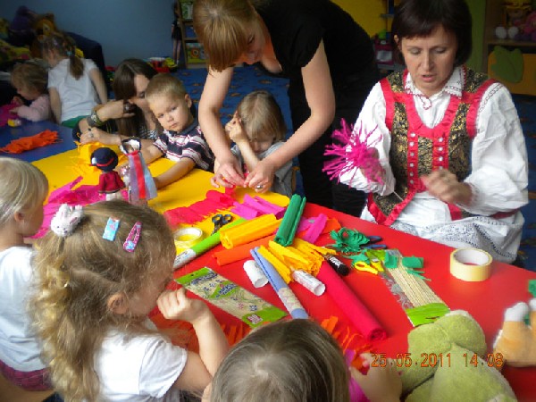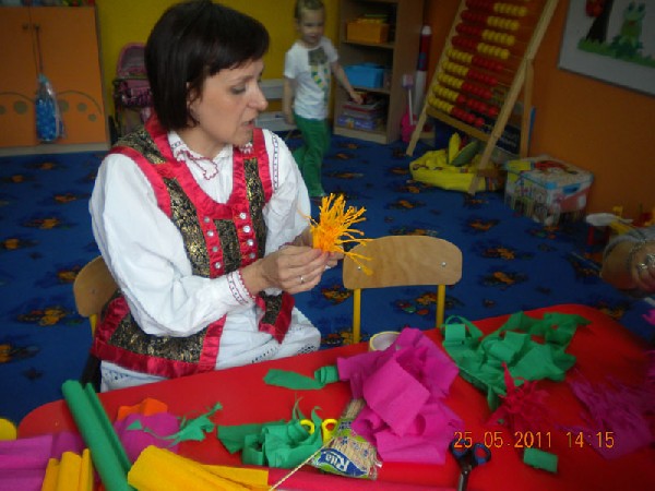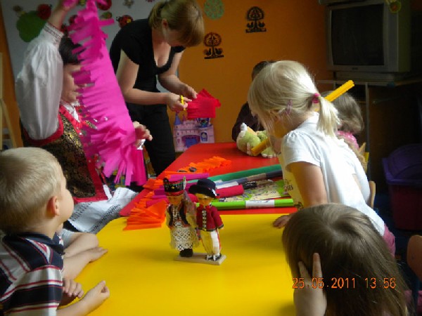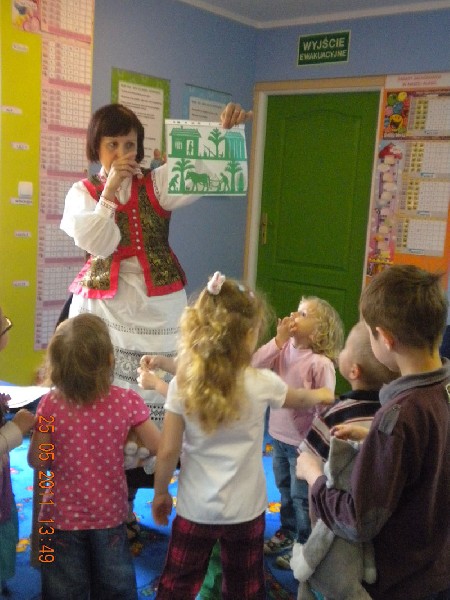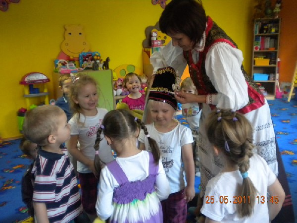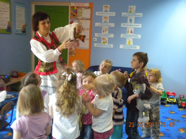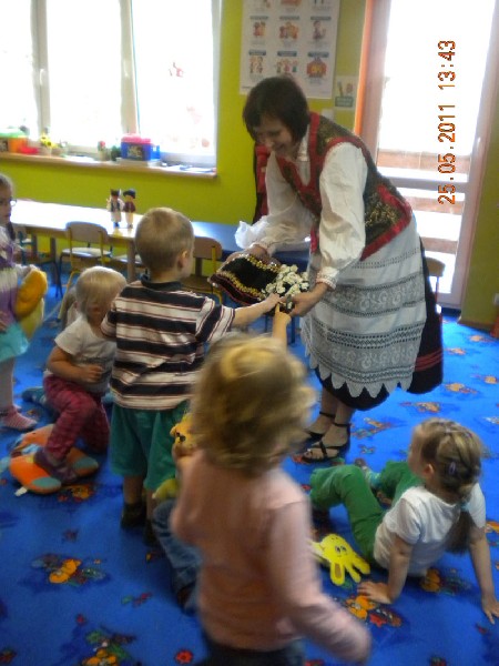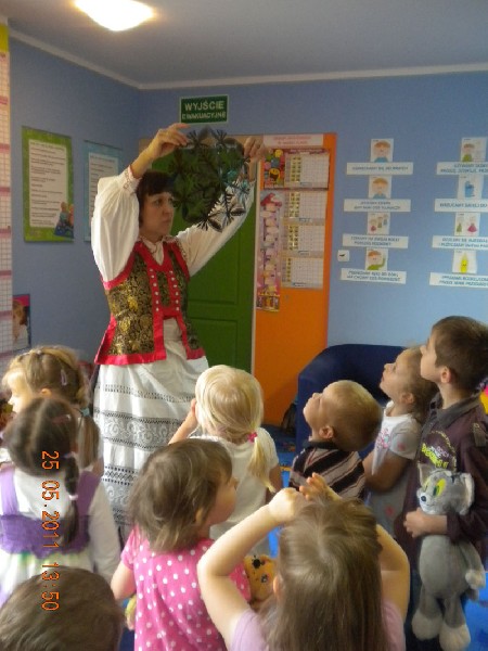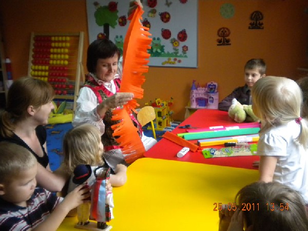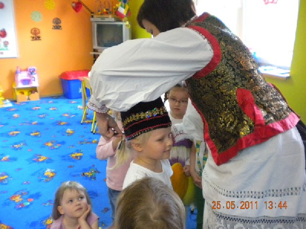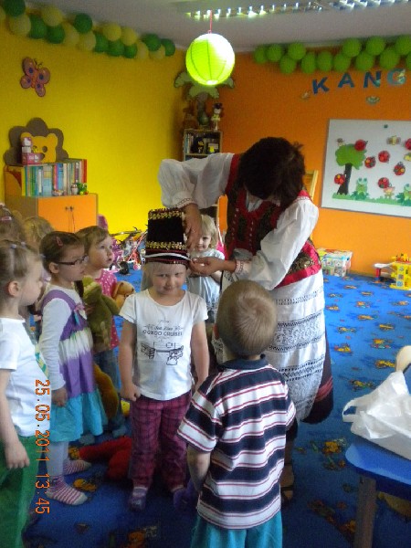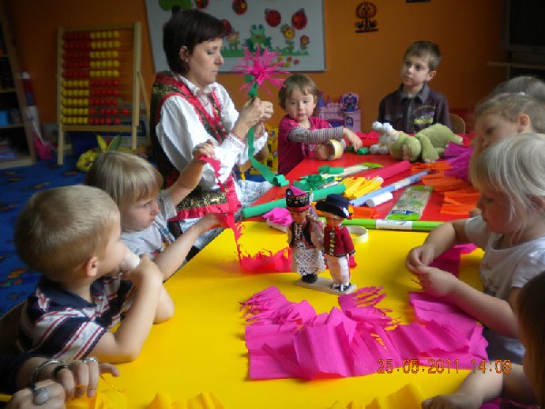 Dzień 25 maja w naszym przedszkolu poświęcony był kurpiowszczyźnie. Na początek dzieci określały gdzie są położone Kurpie. Odpowiedzi były bardzo zaskakujące. Niektórzy twierdzili, że Kurpie są w Afryce, inni, że w ZOO. Przedszkolaki zapoznały się z tradycjami panującymi na terenie Kurpi Zielonych. Miały okazję obejrzeć jak wygląda strój kurpiowski, wycinanki, kwiatki wykonane z bibuły. Punktem kulminacyjnym tego dnia była wizyta Pani Barbary Gut, która przybyła do nas w pięknym, tradycyjnym stroju kurpiowskim. Pani Basia opowiadała nam o kurpiowskich zwyczajach, przyniosła piękne wycinanki. Dziewczynki mogły przymierzyć również kurpiowskie nakrycie głowy, które noszą tylko panny. Następnie Pani Basia pokazała nam różne metody wykonywania kwiatków z bibuły. Dzieci samodzielnie wykonywały bibułkowe kwiaty, którymi obdarowały swoje mamy w dniu ich święta. Głównym celem tych zajęć było wprowadzenie dzieci w świat tradycji ludowych, obyczajów i kultury oraz ukazanie piękna sztuki ludowej ( muzyki, wycinanek, folkloru, stroju ludowego ) regionu kurpiowskiego.