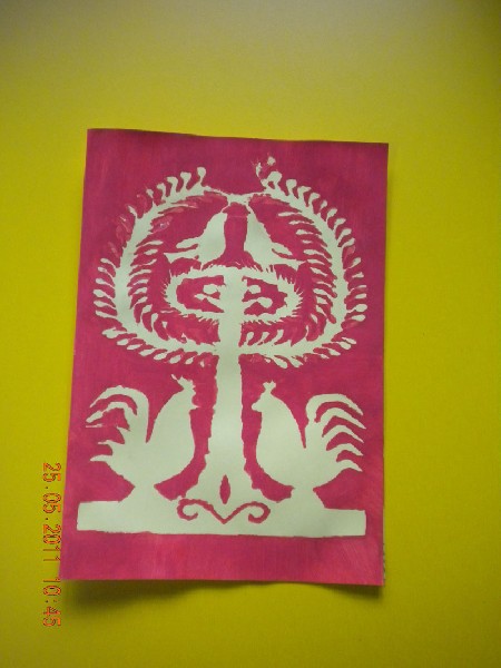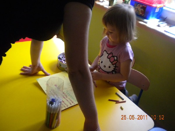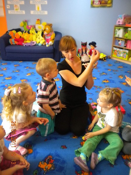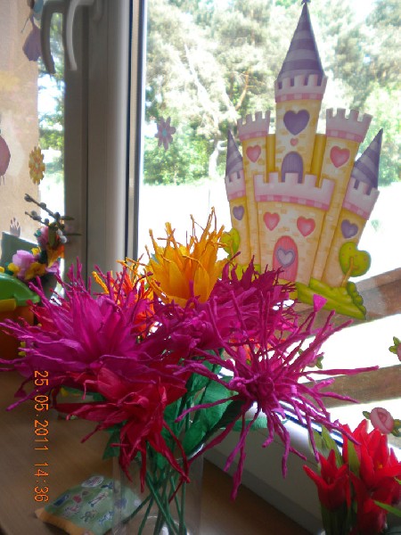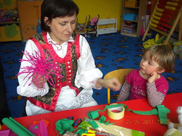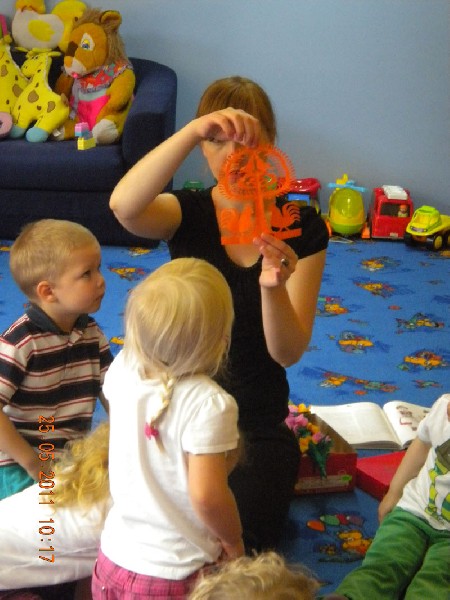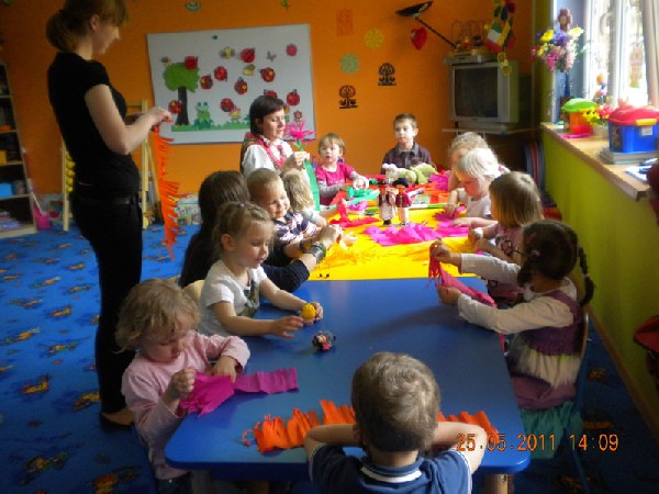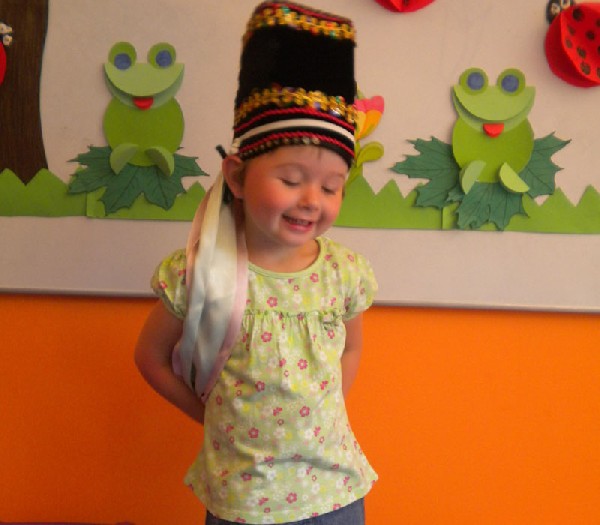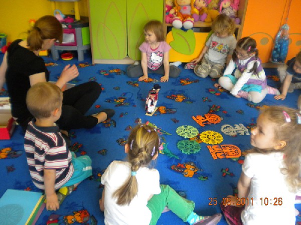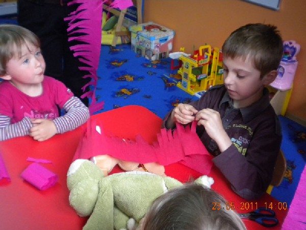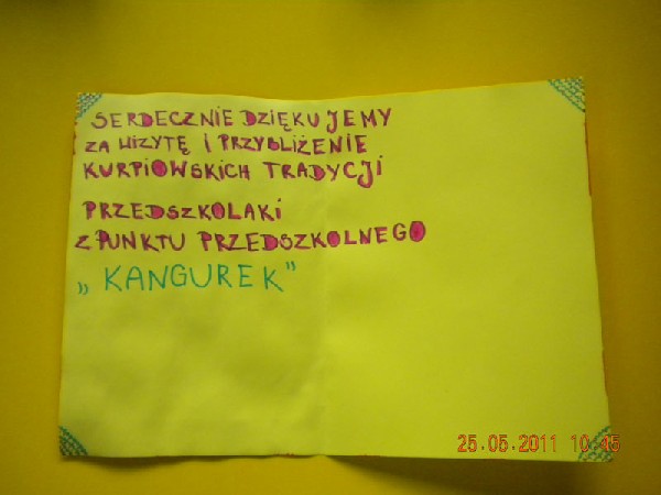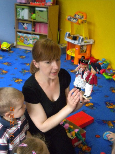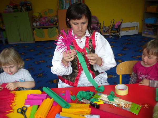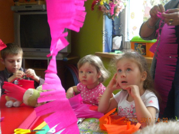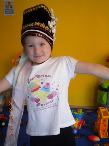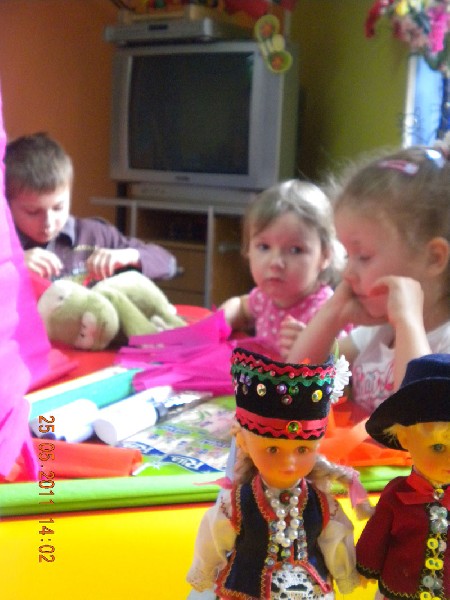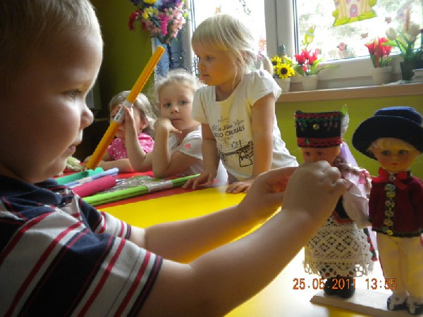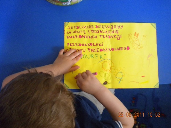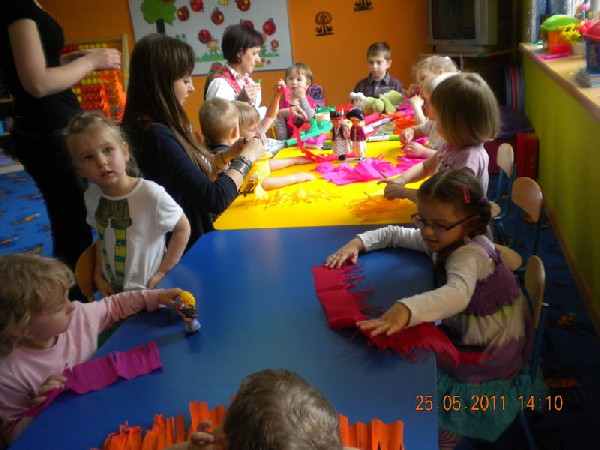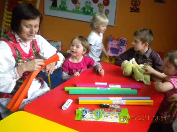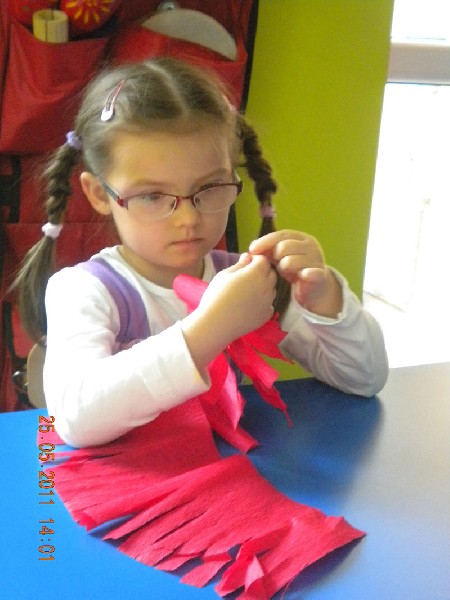 Dzień 25 maja w naszym przedszkolu poświęcony był kurpiowszczyźnie. Na początek dzieci określały gdzie są położone Kurpie. Odpowiedzi były bardzo zaskakujące. Niektórzy twierdzili, że Kurpie są w Afryce, inni, że w ZOO. Przedszkolaki zapoznały się z tradycjami panującymi na terenie Kurpi Zielonych. Miały okazję obejrzeć jak wygląda strój kurpiowski, wycinanki, kwiatki wykonane z bibuły. Punktem kulminacyjnym tego dnia była wizyta Pani Barbary Gut, która przybyła do nas w pięknym, tradycyjnym stroju kurpiowskim. Pani Basia opowiadała nam o kurpiowskich zwyczajach, przyniosła piękne wycinanki. Dziewczynki mogły przymierzyć również kurpiowskie nakrycie głowy, które noszą tylko panny. Następnie Pani Basia pokazała nam różne metody wykonywania kwiatków z bibuły. Dzieci samodzielnie wykonywały bibułkowe kwiaty, którymi obdarowały swoje mamy w dniu ich święta. Głównym celem tych zajęć było wprowadzenie dzieci w świat tradycji ludowych, obyczajów i kultury oraz ukazanie piękna sztuki ludowej ( muzyki, wycinanek, folkloru, stroju ludowego ) regionu kurpiowskiego.