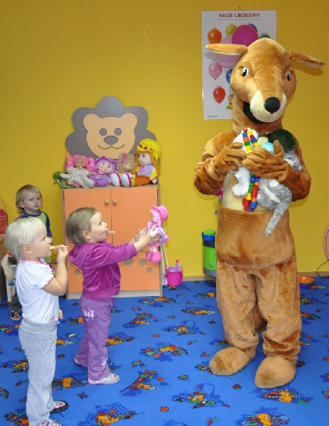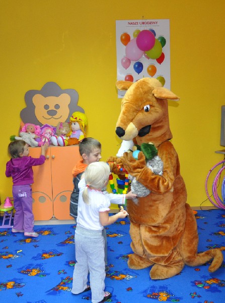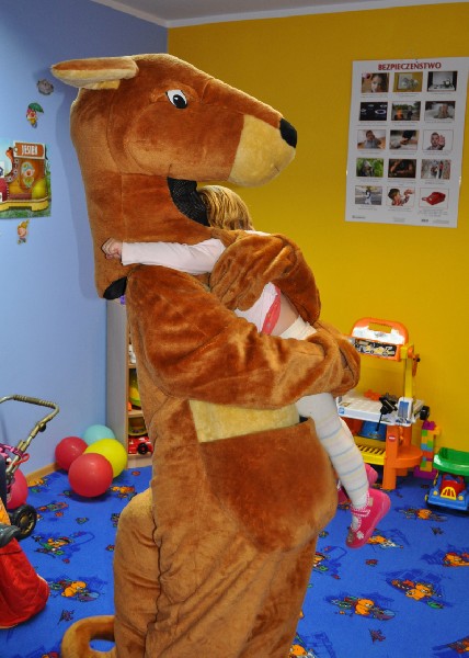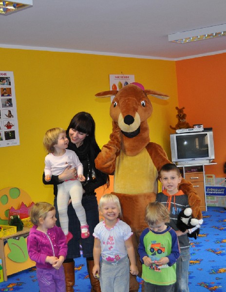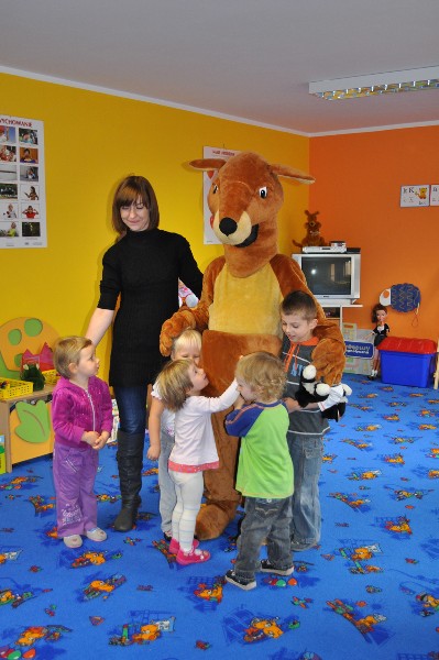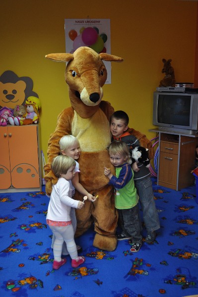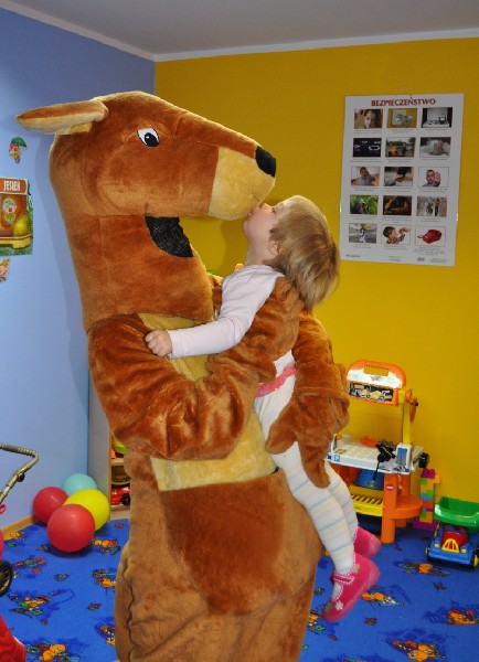 Przedszkolaki wesoło powitały gościa. Zaśpiewały piosenkę „Każdy chce Kangurkiem być” oraz zatańczyły „Taniec Kangurka” wywołując zachwyt naszego gościa. Przedszkolaki pokazały Kangurkowi swoje zabawki i zaprosiły go do zabawy. Dzieci chętnie przytulały się do maskotki. Kangurek nie mógł niestety zostać zbyt długo, ale obiecał, że jeszcze do nas wróci. Dla każdego dziecka zostawił słodki podarunek i czule żegnany przez maluchy opuścił nasze przedszkole.