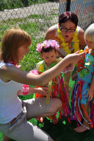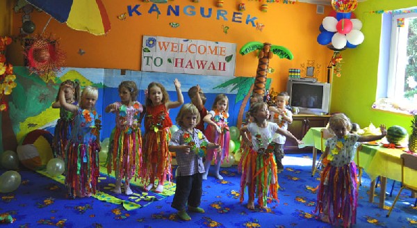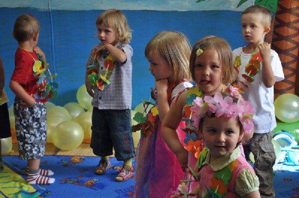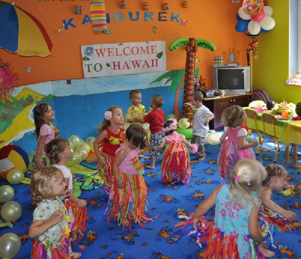 Dnia 12 sierpnia nasza sala przedszkolna zamieniał się w piękną, kolorową oraz gorącą plażę. Wszystko za sprawą obchodów Dnia Hawajskiego. Tego dnia przedszkolaki zgłębiały zwyczaje i tradycje Wysp Hawajskich. Nie mogło oczywiście zabraknąć hawajskich strojów. Wszyscy założyli piękne girlandy z kwiatów a dziewczynki dodatkowo ubrały kolorowe spódniczki. Dzień rozpoczęliśmy od tradycyjnego okrzyku „Aloha!!!” znanego wszystkim na całym świecie. Następnie wszyscy przystąpiliśmy do odtańczenie hawajskiego tańca Hula.