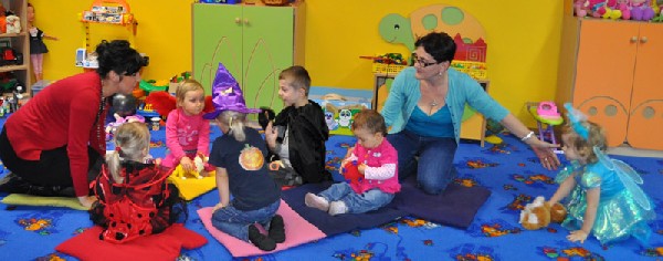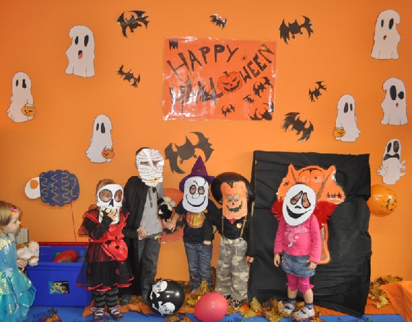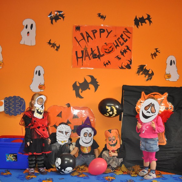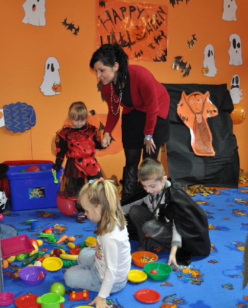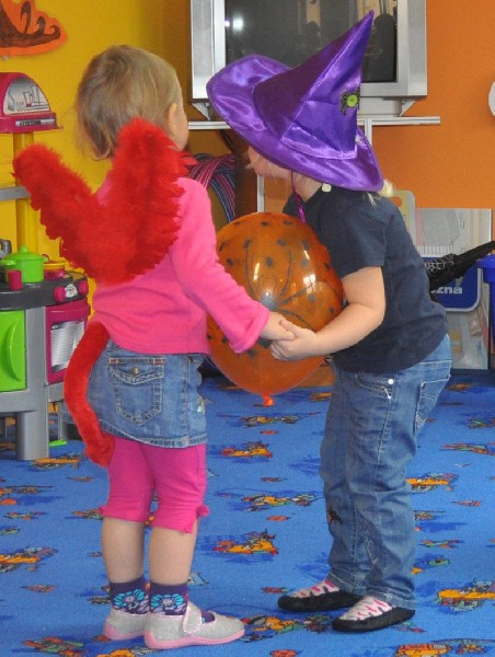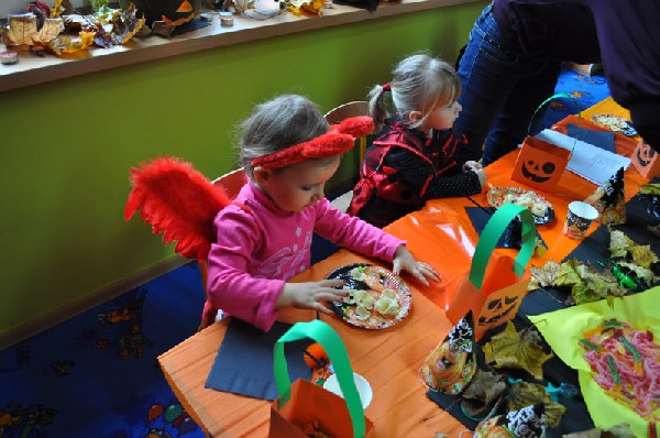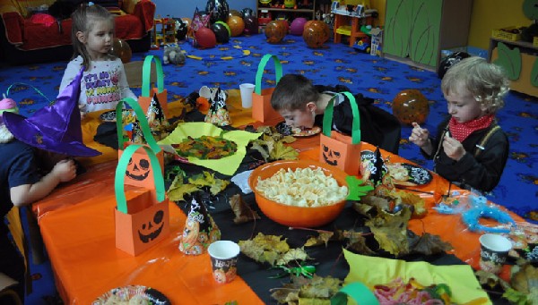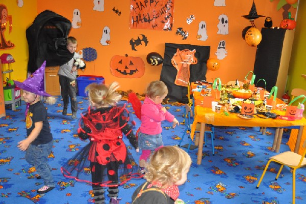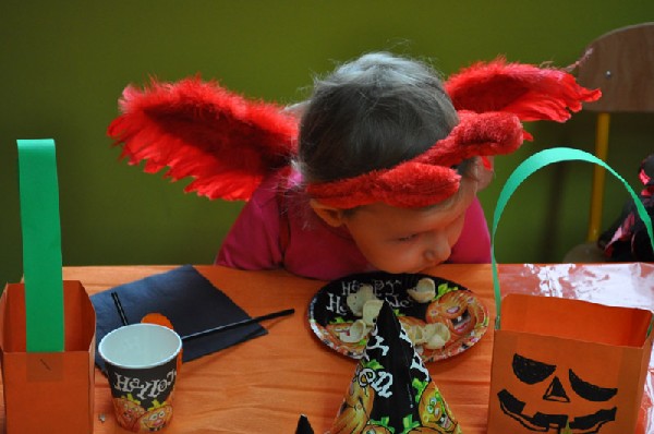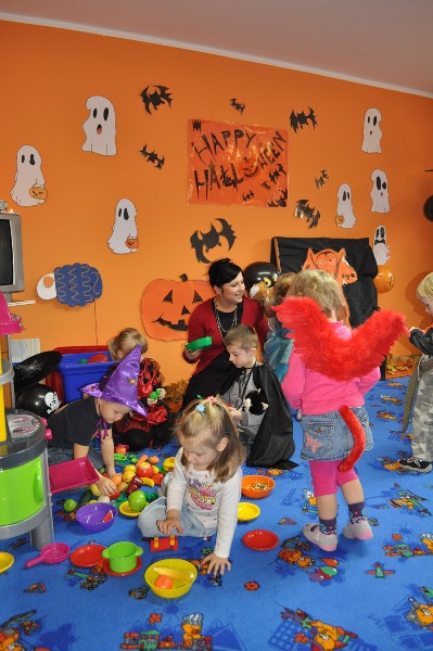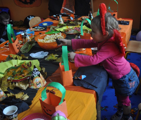 Po śniadaniu rozpoczęła się halloweenowa zabawa. Na początek dzieci zbierały słodycze ukryte w Sali do swoich halloweenowych koszyczków. Nie zabrakło różnych konkursów, zabaw, tańców. Przedszkolaki mogły również przymierzyć upiorne maski i straszyć wszystkich kto przybył do przedszkola. Chociaż tradycja Halloween przyszła do nas zza oceanu w latach 90-tych ubiegłego wieku, to sprawia dzieciom dużo radości i uśmiechu. A przecież w wychowaniu o to chodzi, aby dostarczać dzieciom powodów do radości i zabawy.