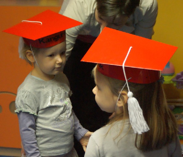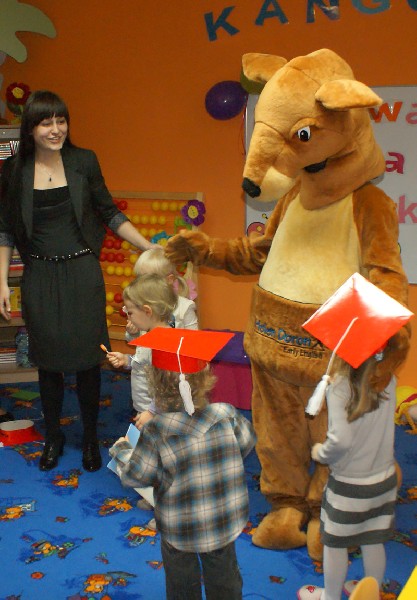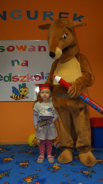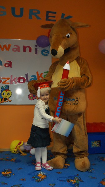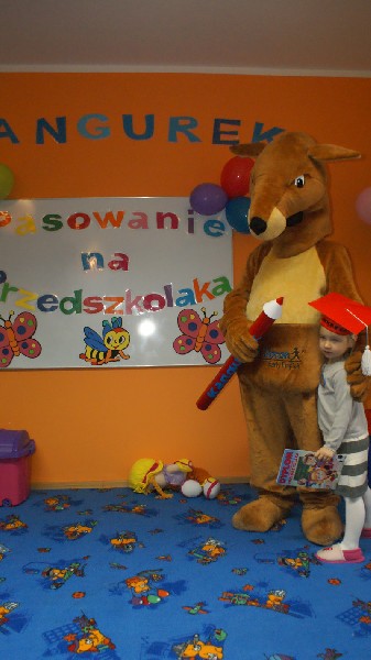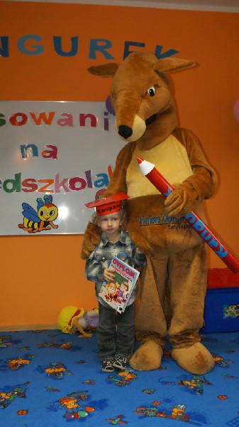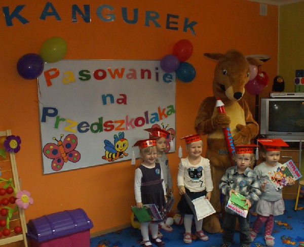 Tego dnia odwiedził nas również Kangurek, który „ogromną czerwoną kredką” pasował przedszkolaków. Na znak przyjęcia dziecka do grona dzieci Punktu Przedszkolnego Kangurek, każdy z milusińskich otrzymał pamiątkowy dyplom oraz znaczek. Uroczyste pasowanie odbyło się w obecności rodziców, wychowawców i oczywiście naszego przyjaciela Kangurka.