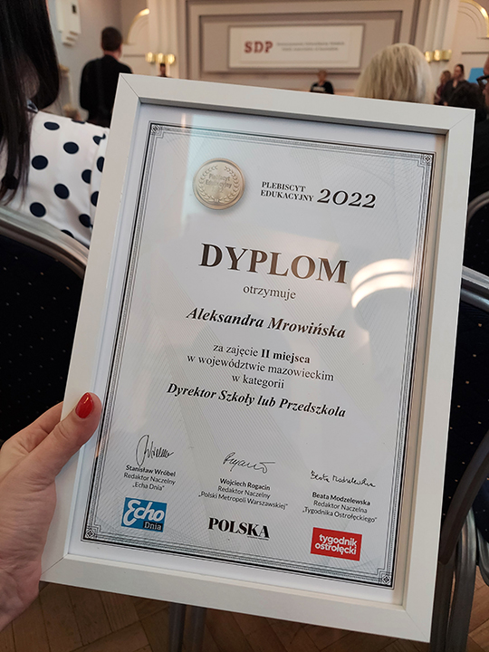 II MIEJSCE w województwie mazowieckim - Aleksandra Mrowińska w kategorii DYREKTOR ROKU PLACÓWKI EDUKACYJNEJ