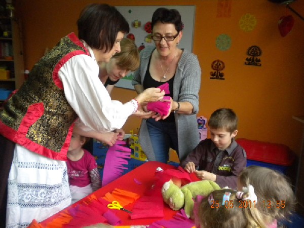 Dzień 25 maja w naszym przedszkolu poświęcony był kurpiowszczyźnie. Na początek dzieci określały gdzie są położone Kurpie. Odpowiedzi były bardzo zaskakujące. Niektórzy twierdzili, że Kurpie są w Afryce, inni, że w ZOO. Przedszkolaki zapoznały się z tradycjami panującymi na terenie Kurpi Zielonych. Miały okazję obejrzeć jak wygląda strój kurpiowski, wycinanki, kwiatki wykonane z bibuły. Punktem kulminacyjnym tego dnia była wizyta Pani Barbary Gut, która przybyła do nas w pięknym, tradycyjnym stroju kurpiowskim. Pani Basia opowiadała nam o kurpiowskich zwyczajach, przyniosła piękne wycinanki. Dziewczynki mogły przymierzyć również kurpiowskie nakrycie głowy, które noszą tylko panny. Następnie Pani Basia pokazała nam różne metody wykonywania kwiatków z bibuły. Dzieci samodzielnie wykonywały bibułkowe kwiaty, którymi obdarowały swoje mamy w dniu ich święta. Głównym celem tych zajęć było wprowadzenie dzieci w świat tradycji ludowych, obyczajów i kultury oraz ukazanie piękna sztuki ludowej ( muzyki, wycinanek, folkloru, stroju ludowego ) regionu kurpiowskiego.